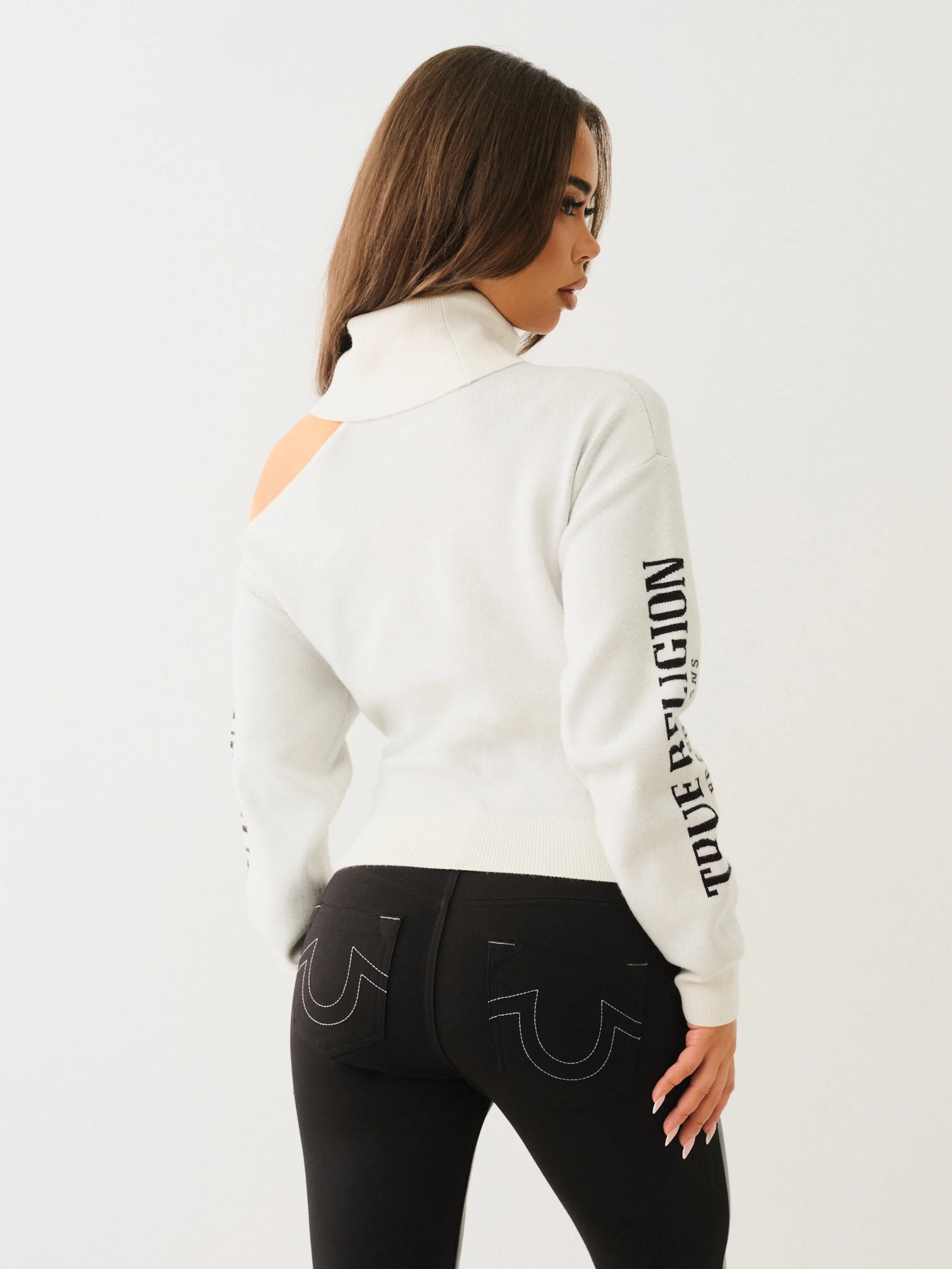 Stay effortlessly stylish and cozy this winter with the True Religion Turtle Neck Cold Shoulder Sweater in Winter White. Its unique cold shoulder design adds a modern twist to classic warmth, while the soft fabric keeps you comfortable all day. Perfect for layering or wearing on its own, this sweater elevates your seasonal wardrobe with both charm and versatility.