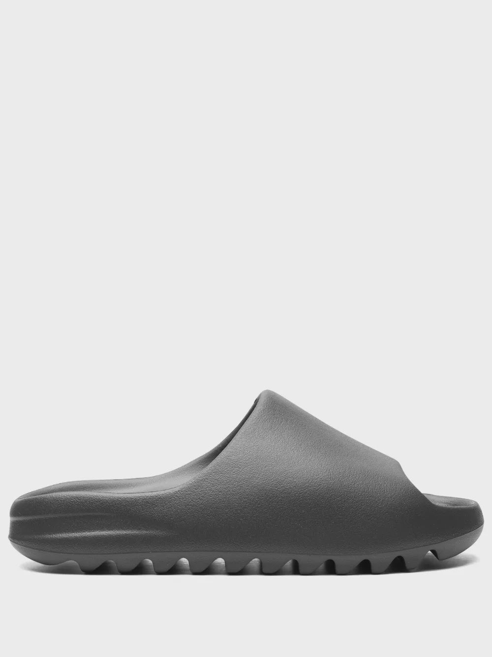 The adidas Yeezy Slide 'Dark Onyx' dresses the casual slip-on in a stealthy charcoal hue. The neutral finish complements a minimalist silhouette built with injected EVA foam. Branding is limited to adidas' three-stripe logo debossed on the soft top layer of the footbed. Underfoot, the outsole features a series of deep horizontal grooves, creating a serrated traction pattern for improved grip and shock absorption.